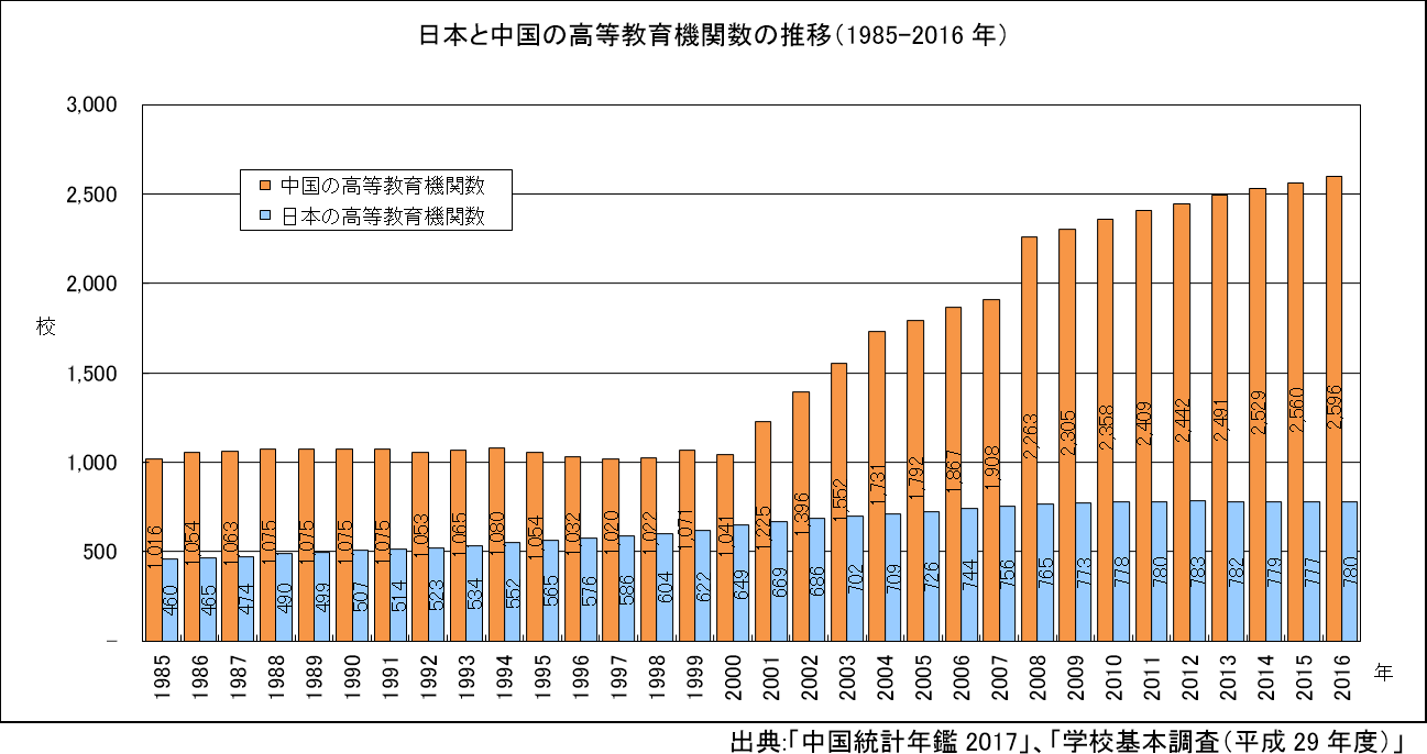 大学の合併・再編で、中国の高等教育機関数は1990年代後半に一時減少に転じたが、1999年に始まった大学生募集数の増加に伴い、2001年より急増し始め、2016年に2,596機関となっている。その中では、専門学校からの昇格が多かった。一方、日本の高等教育機関数も1980年代から微増傾向であったが、近年はほぼ横ばいで推移している。