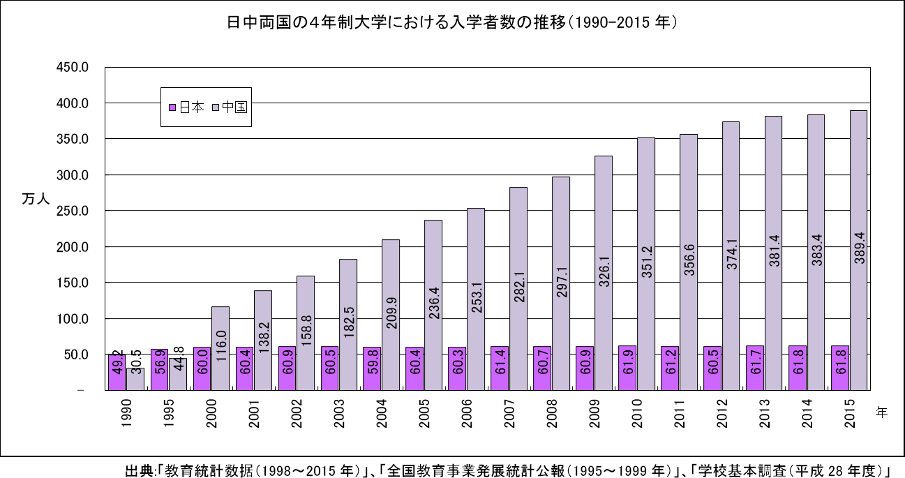 中国における4年制大学の入学者数は1998年に日本を始めて上回り、2015年に日本の6.3倍に相当する389万人となっている。