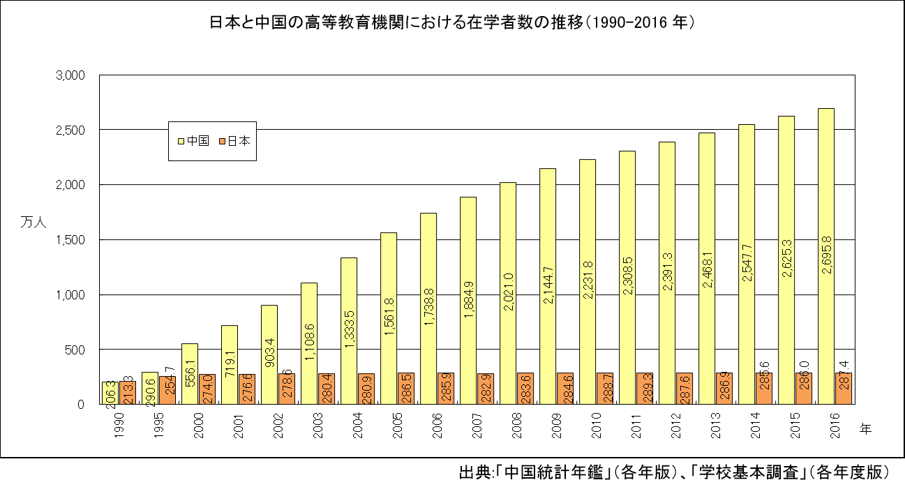 中国における4年制大学の在学者数は、1990年の206万人から2016年の2,696万人に大きく数を伸ばした。一方、日本における4年制大学の在学者数は2005年以降ほぼ横ばいで推移しており、中国との差は9.4倍となっている。