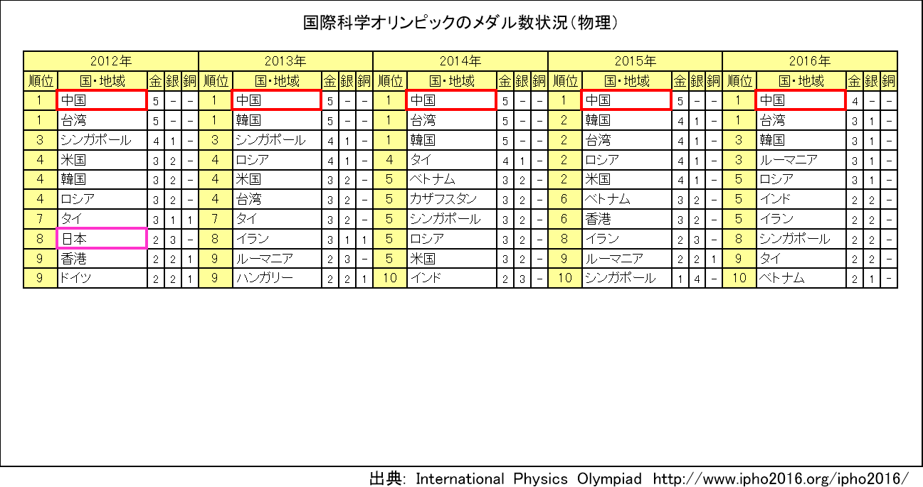 国際科学オリンピックのメダル数(物理分野)では、2011年以降、中国が6年連続してトップの座についている。