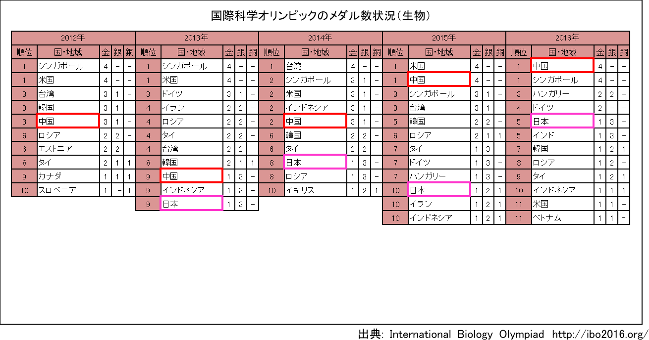 国際科学オリンピックのメダル数(生物分野)では、2016年、中国がシンガポールとともに1位となった。日本も2013年以降、連続 して10位以内となっている。