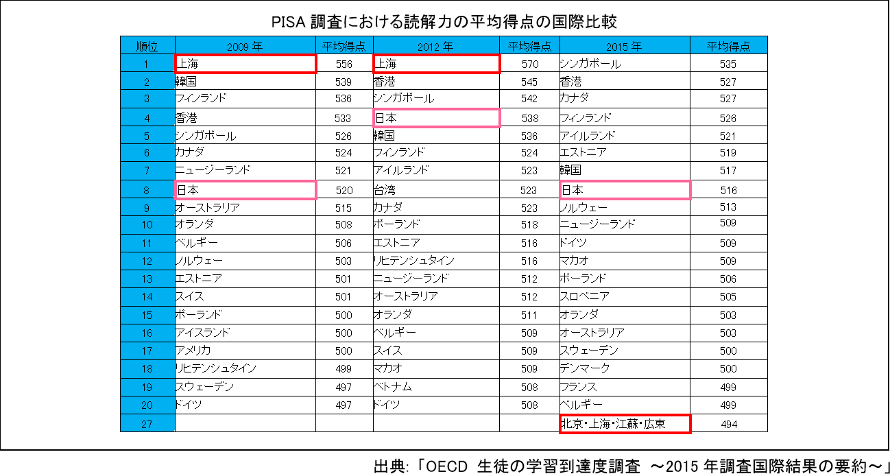 2009年と2012年のPISA調査では、読解力の平均得点で上海市が連続1位となったが、2015年の中国の4省・市は27位であった。
