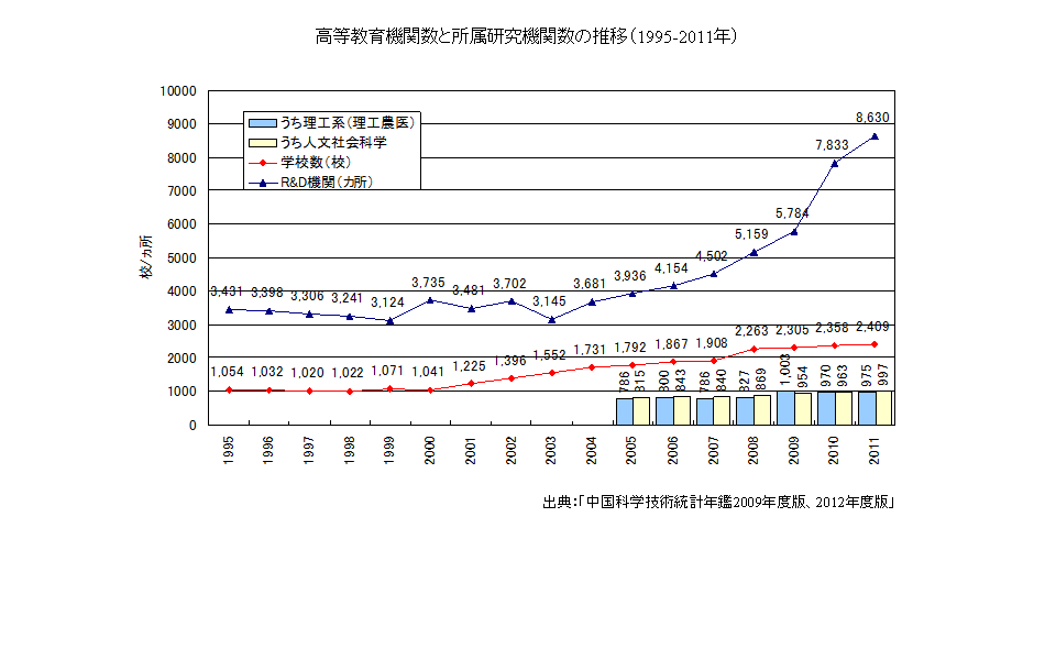 高等教育機関数自体は横ばいであるが、所属の研究機関数は2004年以降急激に増加している。2011年、高等教育機関数2,409校に対し、所属の研究機関数は8,630ヵ所に達している。