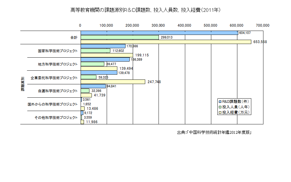 高等教育機関のR&D課題数、投入人員数、投入経費を課題源別に見ると、国家科学技術プロジェクト、地方科学技術プロジェクト、企業委託科学技術プロジェクトがいずれも大きな割合を占めている。
