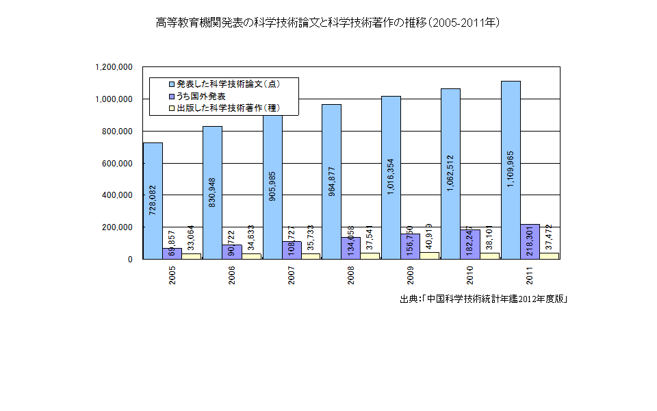 2011年、高等教育機関発表の科学技術論文数は、1,109,965点、うち国外で発表してものは218,301点となっている。また、出版した科学技術著作は37,472点である。