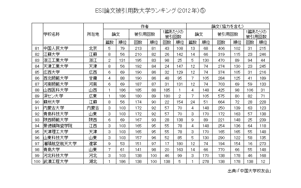 ESI論文被引用数中国の大学ランキング81位から100位は次の表のとおりである。