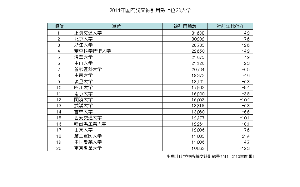 国内論文の被引用数上位20大学では、2011年、1位が