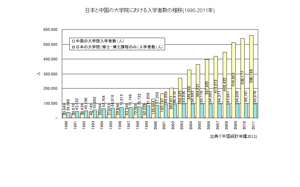 2011年の大学院入学者数は、日本が95,070人、中国が560,168人となっている。