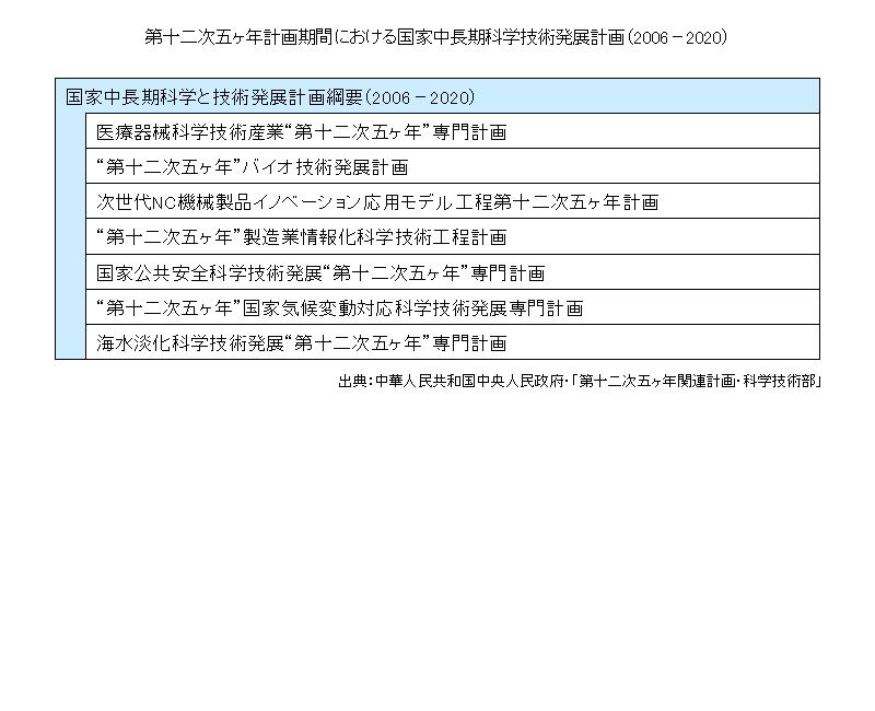 第十二次五ヶ年計画期間(2011年~2015年)において、国家中長期科学技術発展計画(2006-2020)のもとで進行している科学技術計画には次の7つの計画がある。