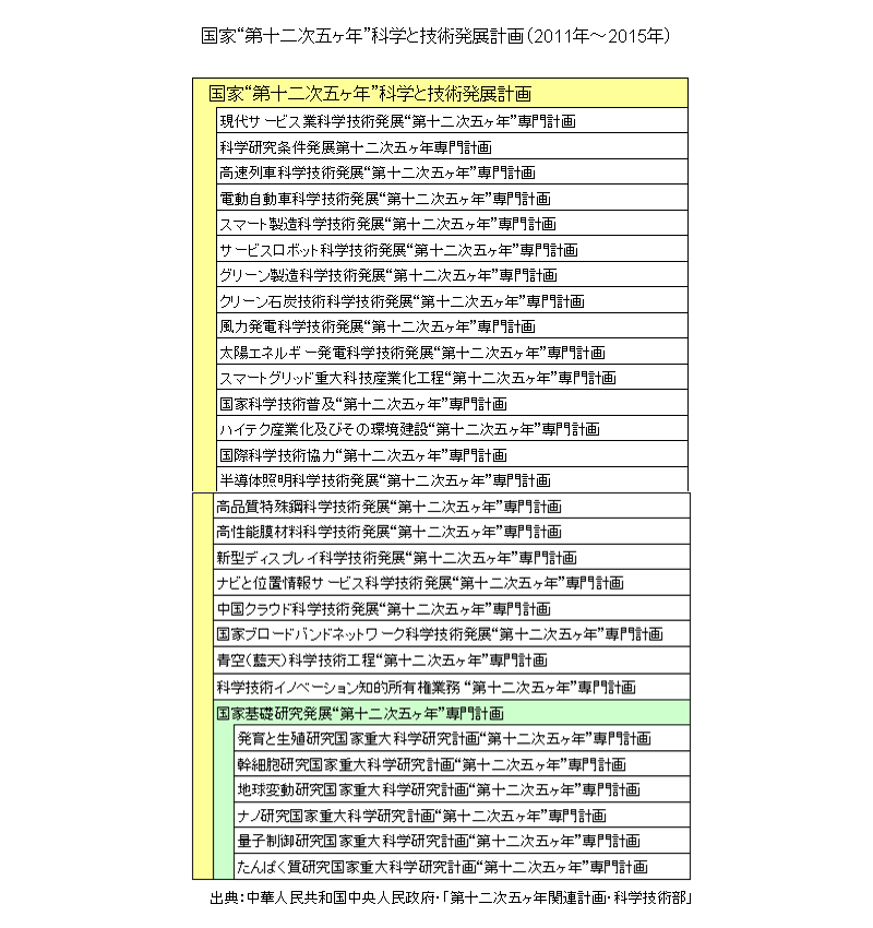 国家“第十二次五ヶ年”科学と技術発展計画(2011年~2015年)のもと、24の専門計画が策定されている。このうち国家基礎研究発展“第十二次五ヶ年”専門計画のもとで、さ らに6つの基礎研究専門計画が組まれている。