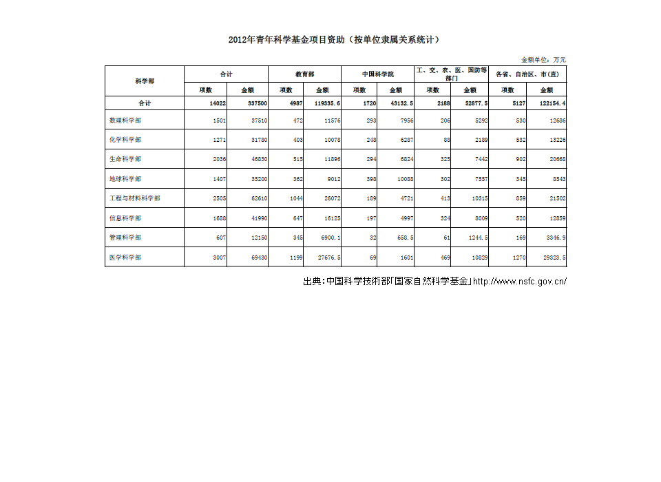 次の表は、国家自然科学基金における青年科学基金プロジェクトの資金援助状況(所属関係別)を示している。