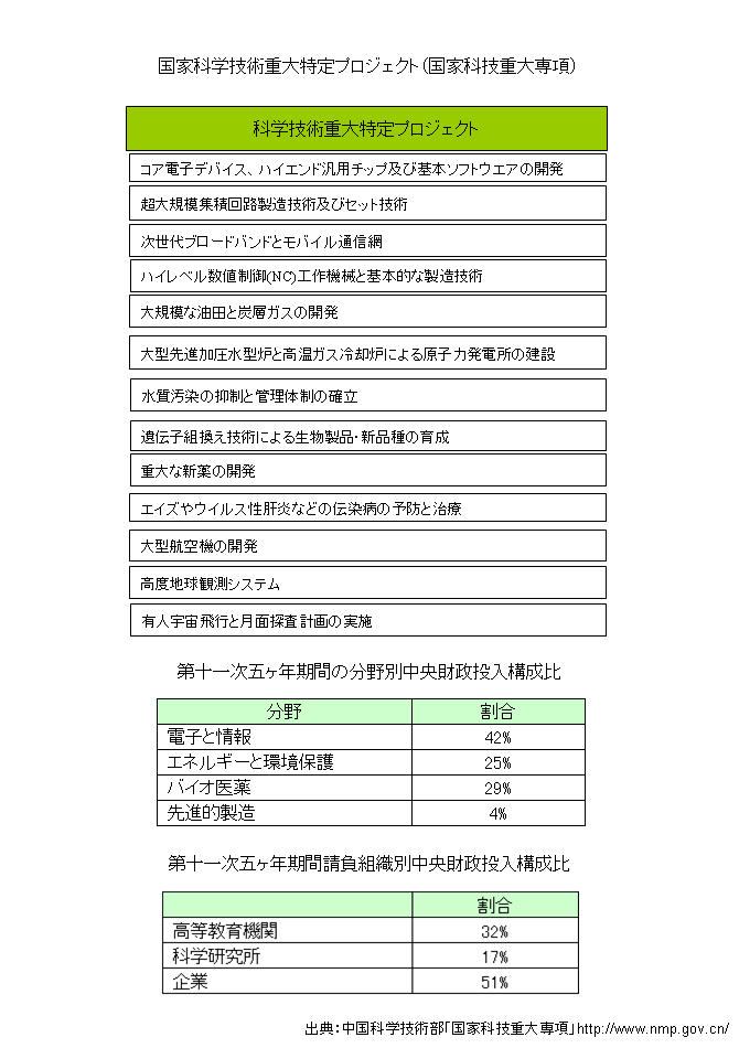 国家科学技術重大特定プロジェクト(国家科技重大専項)には次の13の事業がある。第十一次五ヶ年期間、中央財政投入で、電子と情報分野に42%が投じられている。請負組織は、高等教育機関が32%を 占めた。