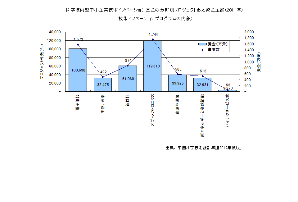 > 主要国家政策データ Index > その他のプログラム > 科学技術型中小企業技術イノベーション基金技術の分野別プロジェクト数と資金金額(2011年)