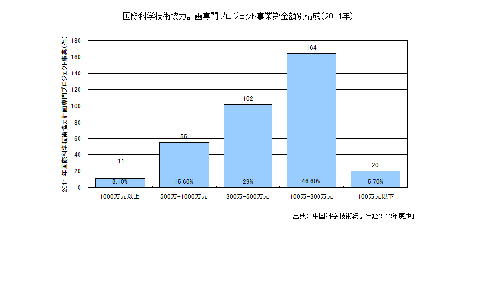 国際科学技術協力計画専門プロジェクトを金額別に見ると、100万-300万元の事業が164件と最も多く46.6%を占めている。