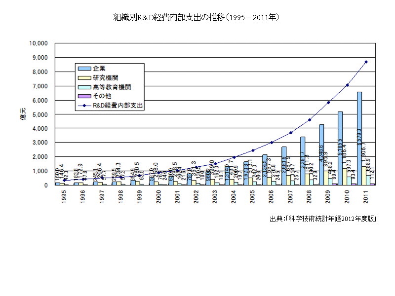 2011年の組織別R&D経費内部支出は、企業が6,579.3億元、研究機関が1,306.7億元、高等教育機関が688.9億元、その他が112.1億元となっている。