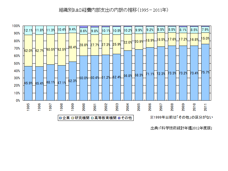 R&D経費内部支出の組織別での割合では、2011年、企業が大部分を占め75.7%、研究機関が15.0%、高等教育機関が7.9%となっている。企業の占める割合が年々増加している。