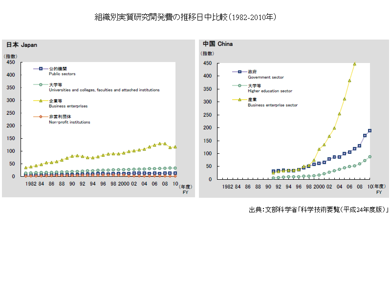 組織別実質研究開発費の推移日中比較(1982-2010年)