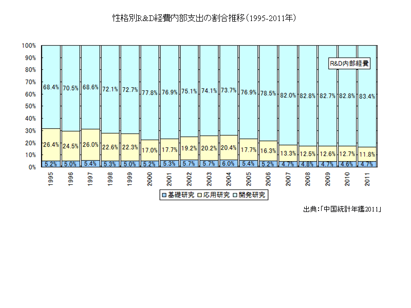 R&D経費内部支出の性格別での割合を見ると、開発研究の割合増加傾向にあり、応用研究と基礎研究の割合は縮小傾向となっている。2011年のR&D経費内部支出のうち、基 礎研究が4.7%、応用研究が11.8%、開発研究が83.4%を占めている。