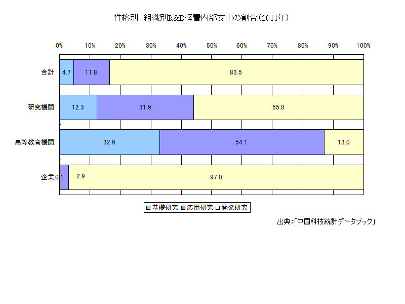 2011年の性格別、組織別R&D経費内部支出の割合は、次のグラフのとおりである。研究機関と高等教育機関では基礎研究、応用研究の割合も小さくない。