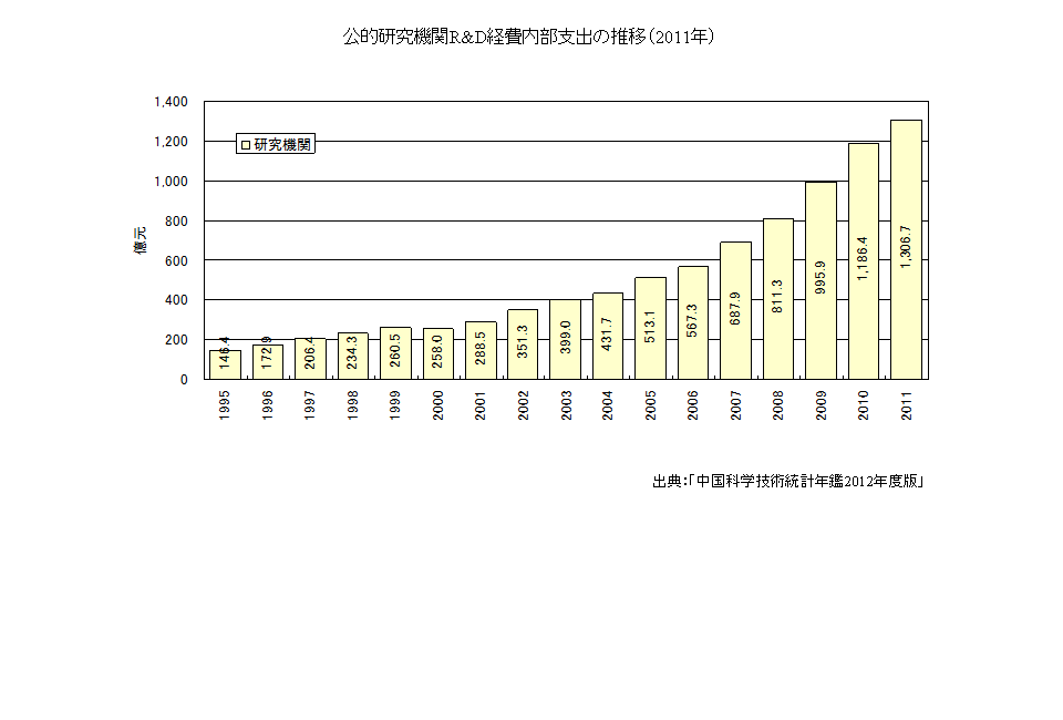 公的研究機関のR&D経費内部支出は1995年以降、増加を続けており、2011年は1,306.7億元に上っている。