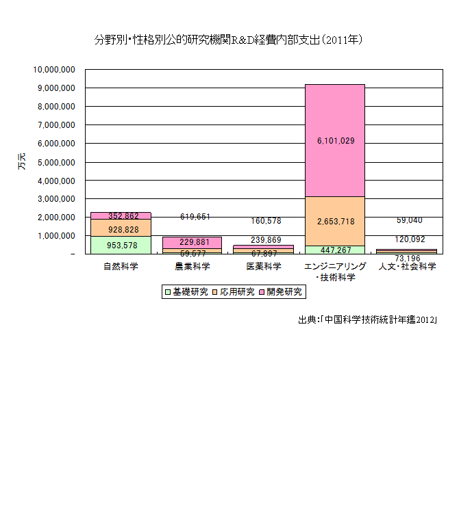 次のグラフは分野別・性格別の公的研究機関のR&D経費内部支出を示している。エンジニアリング・技術科学における開発研究費が最も大きく、610億1,029万元に上っている。