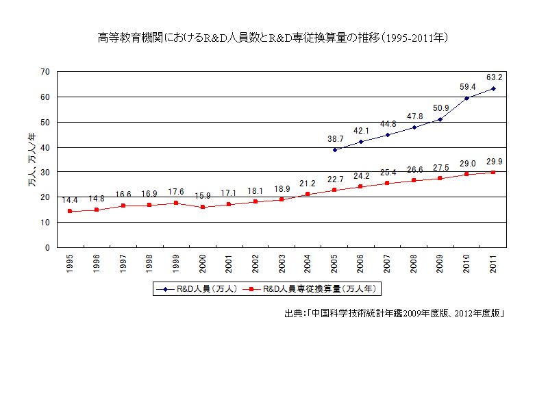 高等教育機関所属の研究所が増加するに従い、そのR&D人員数とR&D専従換算量も増加している。2011年、高等教育機関のR&D人員数は63.2万人、専 従換算量で29.9万人/年となっている。