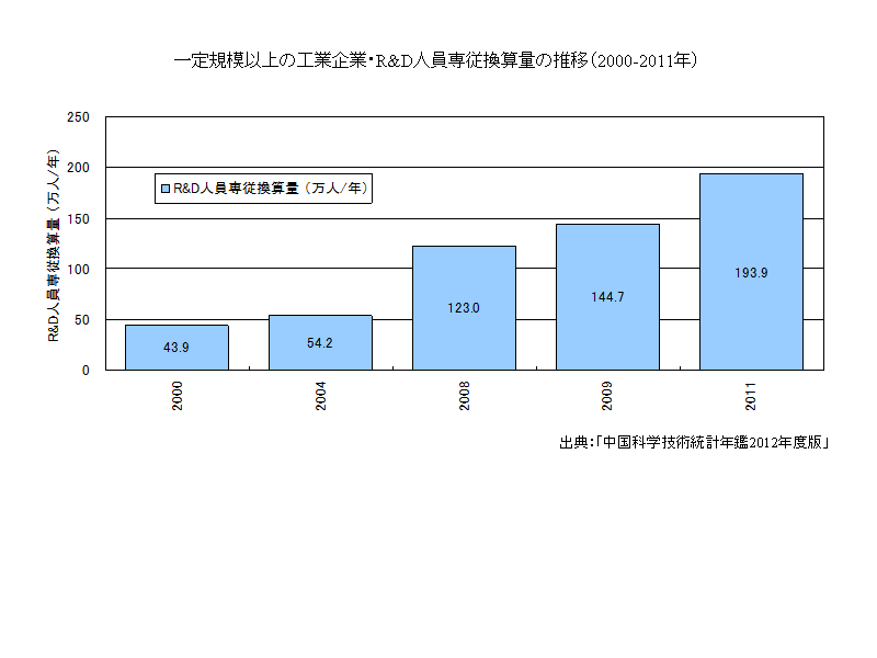 一定規模以上の工業企業・R&D人員専従換算量の推移(2000-2011年)