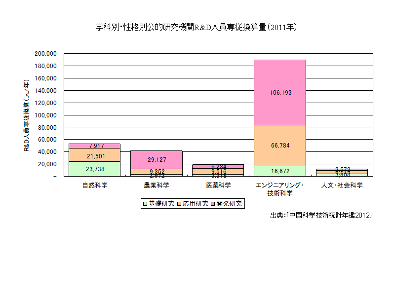 次のグラフは、学科別・性格別の公的研究機関R&D人員専従換算量を示している。エンジニアリング・技術科学において、基礎研究が16,672人/年、応用研究が66,784人/年、開 発研究が106,193人/年となっている。