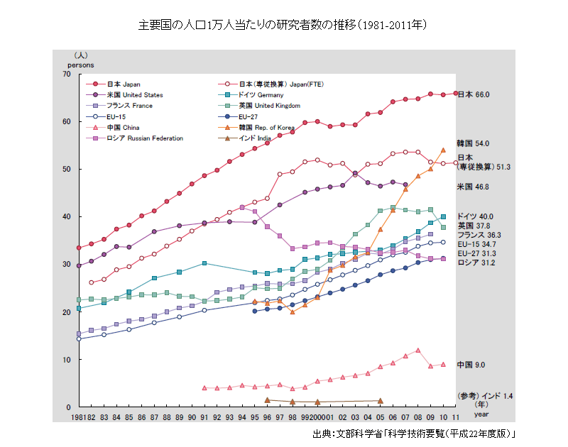 人口及び労働力人口1万人当たりの研究者数は、主要国で全体的に拡大しており、2011年、1位が日本で66.0人、2位が韓国で54.0人となっている。米国は46.8人、中国は9.0人である。