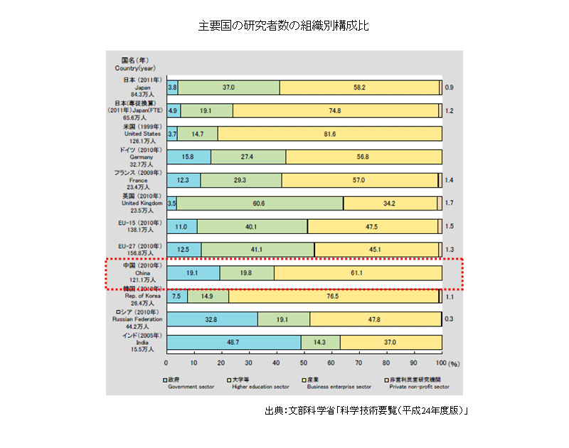 中国の研究者数の組織別構成比は、政府が19.1%、大学等高等(教育機関)が19.8%、産業(企業)が61.1%を占めている。