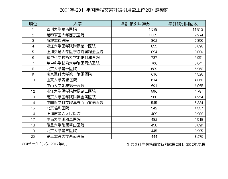2001年-2011年にかけての国際論文累計被引用数上位20医療機関は次のとおりである。1位が四川大学華西医院、2位が第四軍医大学西京医院、3位が解放軍総医院となっている。