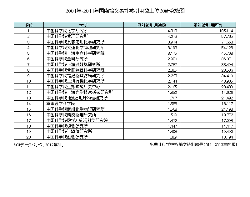 2001年-2011年にかけての国際論文累計被引用数上位20研究機関は次のとおりである。1位が中国科学院化学研究所、2位が中国科学院物理研究所、3位が中国科学院長春応用化学研究所となっている。