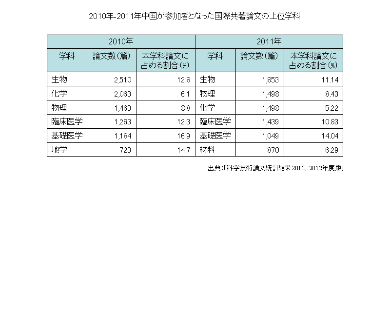 > 科学技術基礎データ > 研究成果関係指標(学術論文の動向) > 2010年-2011年中国が参加者となった国際共著論文の上位学科