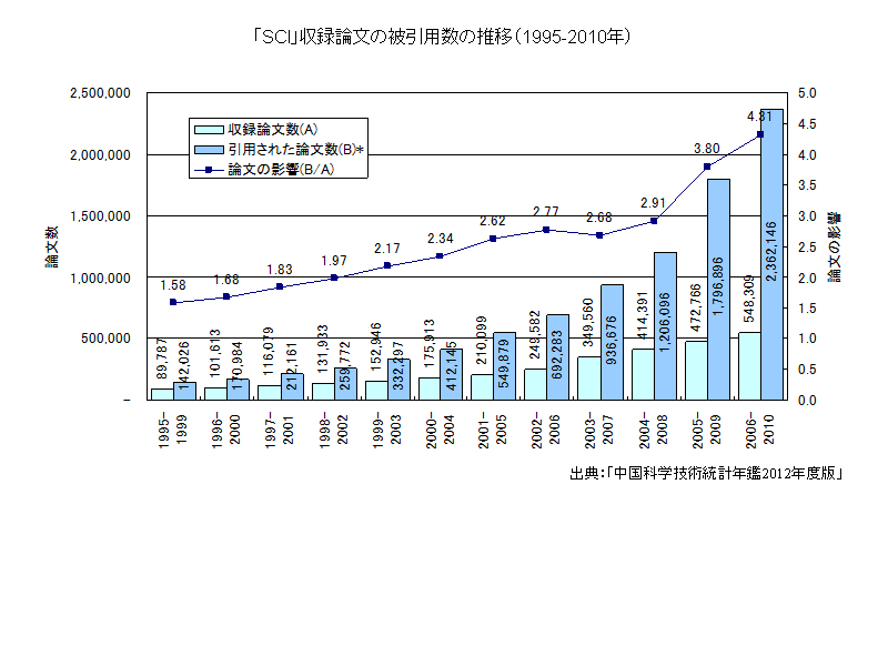 > 科学技術基礎データ > 研究成果関係指標(学術論文の動向) > 「SCI」収録論文の被引用数の推移(1995-2010年)