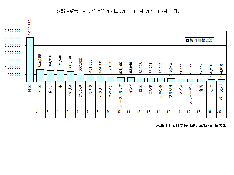 ESI論文数ランキングの上位20ヶ国は次のグラフのとおりである。2001年から2011年の累計で、1位は米国の3,049,662点、2位は中国の836,255点となっている。