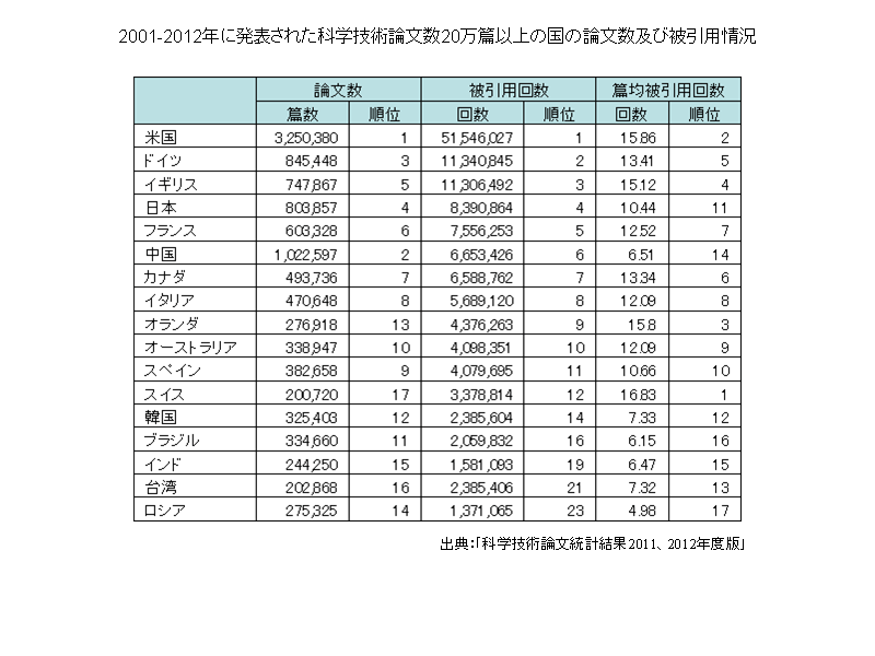 > 科学技術基礎データ > 研究成果関係指標(学術論文の動向) > 2001-2012年に発表された科学技術論文数20万篇以上の国の論文数及び被引用情況