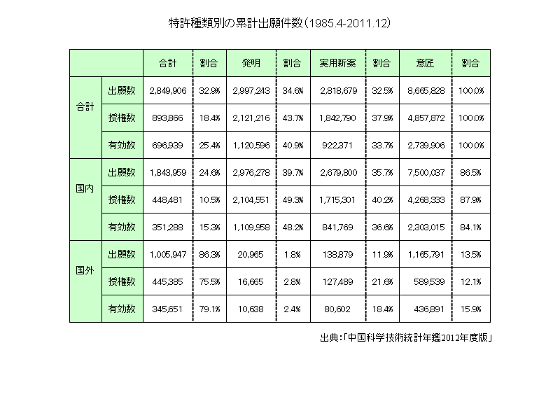 > 科学技術基礎データ > 研究成果関係指標(特許出願の動向) > 特許種類別の累計出願件数(1985.4-2011.12)