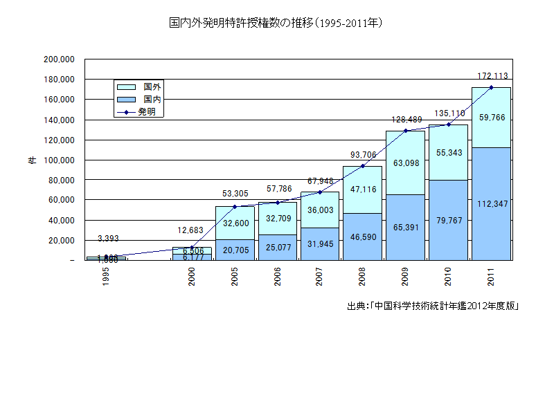 国内外での発明特許の授権数は2011年、172,113件となっており、このうち国内が112,347件、国外からが59,766件となっている。