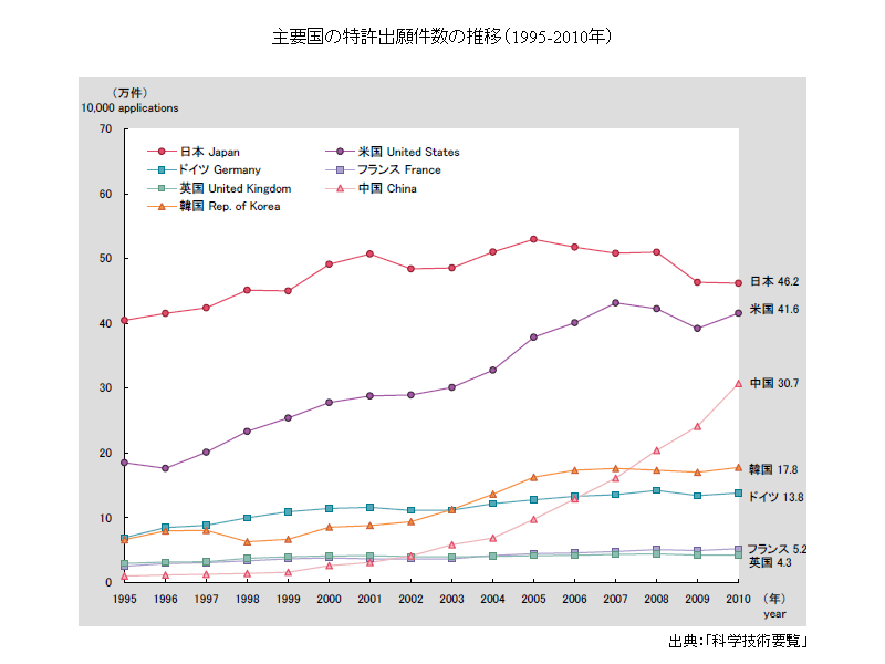 主要国の特許出願件数の推移は次のグラフのとおりである。2010年、1位が日本で46.2万件、2位が米国で41.6万件、3位が中国で30.7万件となっている。