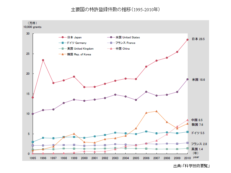次のグラフは主要国の特許登録件数の推移を示している。2010年、1位が日本で28.5万件、2位が米国で18.6万件、3位が中国で8.5万件となっている。