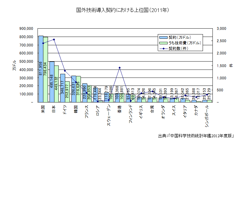 中国の国外技術導入契約における上位国は次のグラフのとおりである。2011年、契約金額ベースで1位が米国の811,956万ドル、2位が日本の495,148万ドルとなっている。